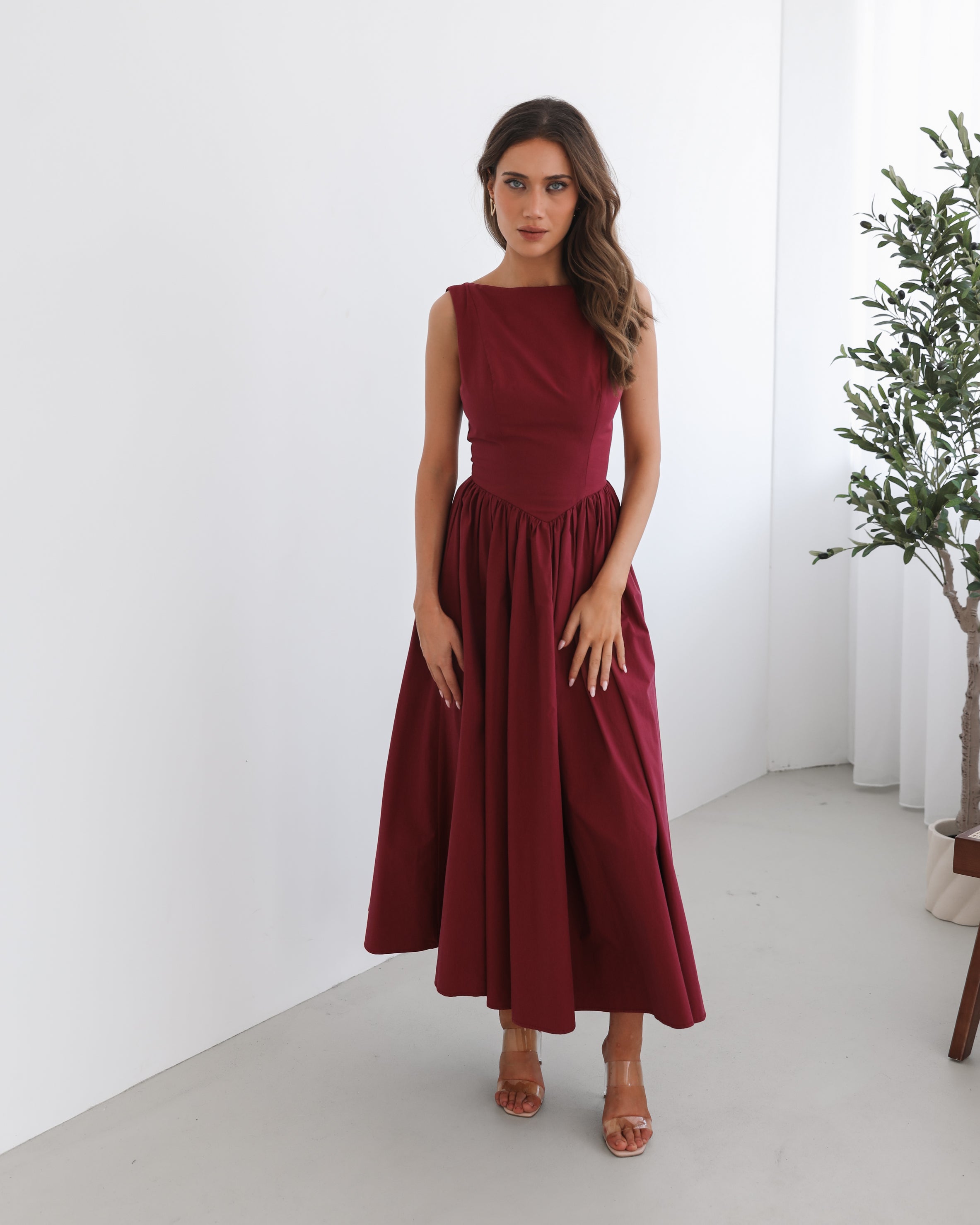 Our Karsyn Dress comes in a wine red colour. Perfect for evening affairs, yet remains refined enough for upscale daytime events, this number features a boat neckline, full skirt and maxi length hem. Style it with classic stiletto heels and diamond or pearl earrings for an elevated formal look!