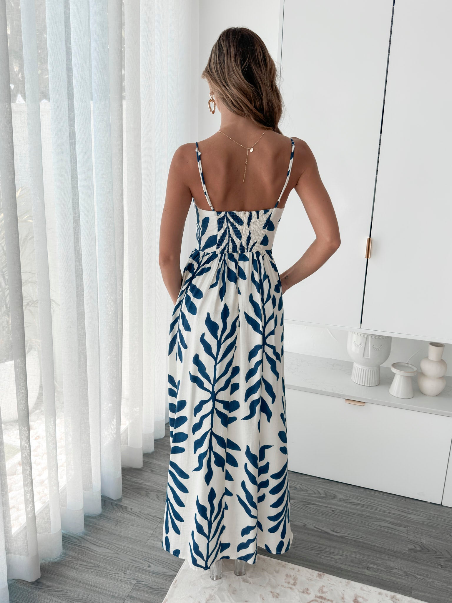 Our Vyraiah Dress comes in a beige base with blue prints. Radiate organic charm in this number that features spaghetti straps, square neckline, flowy a-line skirt and midi length hem. Style with flat sandals, a crossbody satchel, and minimalist gold hoops for understated elegance.